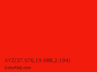 XYZ 37.076,19.688,2.194 Color is a normal red color and the nearest color is Red RYB #fe2712. Hex code #f21b0c and RGB value is rgb(242,27,12). In RGB color space, this color is composed of 95% red, 11% green, 5% blue, In CMYK color space, this color is composed of 0% cyan, 89% magenta, 95% yellow , 5% black , In HSL color space, this color has a hue angle of 4° , 91% saturation and 50% lightness.