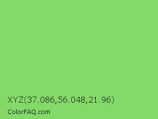 XYZ 37.086,56.048,21.96 Color is a light green color and the nearest color is Pastel Green #77dd77. Hex code #84da68 and RGB value is rgb(132,218,104). In RGB color space, this color is composed of 52% red, 85% green, 41% blue, In CMYK color space, this color is composed of 39% cyan, 0% magenta, 52% yellow , 15% black , In HSL color space, this color has a hue angle of 105° , 61% saturation and 63% lightness.