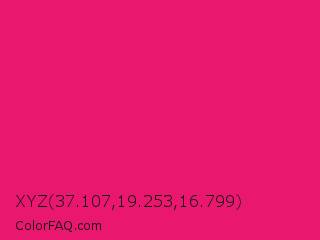 XYZ 37.107,19.253,16.799 Color is a normal rose color and the nearest color is Razzmatazz #e3256b. Hex code #ea176f and RGB value is rgb(234,23,111). In RGB color space, this color is composed of 92% red, 9% green, 44% blue, In CMYK color space, this color is composed of 0% cyan, 90% magenta, 53% yellow , 8% black , In HSL color space, this color has a hue angle of 335° , 83% saturation and 50% lightness.