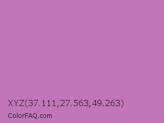 XYZ 37.111,27.563,49.263 Color is a light magenta color and the nearest color is Sky Magenta #cf71af. Hex code #c175b9 and RGB value is rgb(193,117,185). In RGB color space, this color is composed of 76% red, 46% green, 73% blue, In CMYK color space, this color is composed of 0% cyan, 39% magenta, 4% yellow , 24% black , In HSL color space, this color has a hue angle of 306° , 38% saturation and 61% lightness.