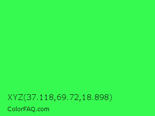 XYZ 37.118,69.72,18.898 Color is a normal green color and the nearest color is Screamin Green #66ff66. Hex code #36fa4f and RGB value is rgb(54,250,79). In RGB color space, this color is composed of 21% red, 98% green, 31% blue, In CMYK color space, this color is composed of 78% cyan, 0% magenta, 68% yellow , 2% black , In HSL color space, this color has a hue angle of 128° , 95% saturation and 60% lightness.