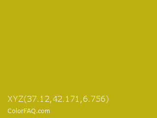 XYZ 37.12,42.171,6.756 Color is a normal yellow color and the nearest color is Sahara #b7a214. Hex code #bfb012 and RGB value is rgb(191,176,18). In RGB color space, this color is composed of 75% red, 69% green, 7% blue, In CMYK color space, this color is composed of 0% cyan, 8% magenta, 91% yellow , 25% black , In HSL color space, this color has a hue angle of 55° , 83% saturation and 41% lightness.