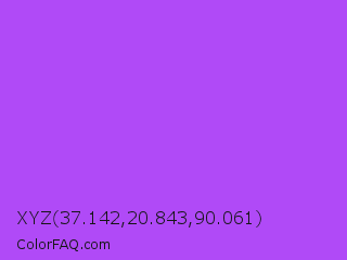 XYZ 37.142,20.843,90.061 Color is a light purple color and the nearest color is Navy Purple #9457eb. Hex code #b04af7 and RGB value is rgb(176,74,247). In RGB color space, this color is composed of 69% red, 29% green, 97% blue, In CMYK color space, this color is composed of 29% cyan, 70% magenta, 0% yellow , 3% black , In HSL color space, this color has a hue angle of 275° , 92% saturation and 63% lightness.