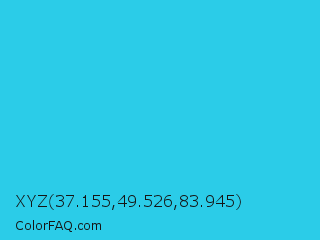 XYZ 37.155,49.526,83.945 Color is a normal cyan color and the nearest color is Scooter #2ebfd4. Hex code #2bcce8 and RGB value is rgb(43,204,232). In RGB color space, this color is composed of 17% red, 80% green, 91% blue, In CMYK color space, this color is composed of 81% cyan, 12% magenta, 0% yellow , 9% black , In HSL color space, this color has a hue angle of 189° , 80% saturation and 54% lightness.