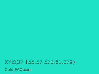 XYZ 37.155,57.573,61.379 Color is a normal cyan color and the nearest color is Turquoise PWG #30d5c8. Hex code #1ee0c4 and RGB value is rgb(30,224,196). In RGB color space, this color is composed of 12% red, 88% green, 77% blue, In CMYK color space, this color is composed of 87% cyan, 0% magenta, 13% yellow , 12% black , In HSL color space, this color has a hue angle of 171° , 76% saturation and 50% lightness.