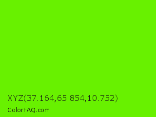 XYZ 37.164,65.854,10.752 Color is a normal green color and the nearest color is Bright Green #66ff00. Hex code #68f100 and RGB value is rgb(104,241,0). In RGB color space, this color is composed of 41% red, 95% green, 0% blue, In CMYK color space, this color is composed of 57% cyan, 0% magenta, 100% yellow , 5% black , In HSL color space, this color has a hue angle of 94° , 100% saturation and 47% lightness.