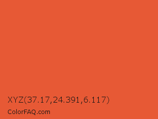 XYZ 37.17,24.391,6.117 Color is a normal red color and the nearest color is Flame Pea #da5b38. Hex code #e75935 and RGB value is rgb(231,89,53). In RGB color space, this color is composed of 91% red, 35% green, 21% blue, In CMYK color space, this color is composed of 0% cyan, 61% magenta, 77% yellow , 9% black , In HSL color space, this color has a hue angle of 12° , 79% saturation and 56% lightness.