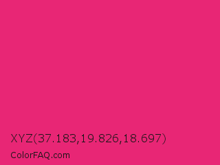 XYZ 37.183,19.826,18.697 Color is a normal rose color and the nearest color is Razzmatazz #e3256b. Hex code #e82675 and RGB value is rgb(232,38,117). In RGB color space, this color is composed of 91% red, 15% green, 46% blue, In CMYK color space, this color is composed of 0% cyan, 84% magenta, 50% yellow , 9% black , In HSL color space, this color has a hue angle of 336° , 81% saturation and 53% lightness.
