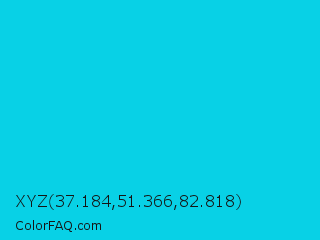XYZ 37.184,51.366,82.818 Color is a normal cyan color and the nearest color is Dark Turquoise #00ced1. Hex code #08d1e6 and RGB value is rgb(8,209,230). In RGB color space, this color is composed of 3% red, 82% green, 90% blue, In CMYK color space, this color is composed of 97% cyan, 9% magenta, 0% yellow , 10% black , In HSL color space, this color has a hue angle of 186° , 93% saturation and 47% lightness.