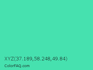 XYZ 37.189,58.248,49.84 Color is a normal green color and the nearest color is Eucalyptus #44d7a8. Hex code #46e1af and RGB value is rgb(70,225,175). In RGB color space, this color is composed of 27% red, 88% green, 69% blue, In CMYK color space, this color is composed of 69% cyan, 0% magenta, 22% yellow , 12% black , In HSL color space, this color has a hue angle of 161° , 72% saturation and 58% lightness.