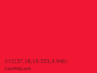 XYZ 37.18,19.553,4.946 Color is a normal red color and the nearest color is Torch Red #fd0e35. Hex code #f11733 and RGB value is rgb(241,23,51). In RGB color space, this color is composed of 95% red, 9% green, 20% blue, In CMYK color space, this color is composed of 0% cyan, 90% magenta, 79% yellow , 5% black , In HSL color space, this color has a hue angle of 352° , 89% saturation and 52% lightness.