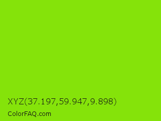 XYZ 37.197,59.947,9.898 Color is a normal green color and the nearest color is Alien Armpit #84de02. Hex code #85e30a and RGB value is rgb(133,227,10). In RGB color space, this color is composed of 52% red, 89% green, 4% blue, In CMYK color space, this color is composed of 41% cyan, 0% magenta, 96% yellow , 11% black , In HSL color space, this color has a hue angle of 86° , 92% saturation and 46% lightness.