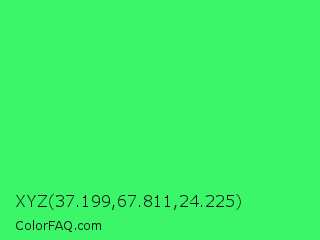 XYZ 37.199,67.811,24.225 Color is a normal green color and the nearest color is UFO Green #3cd070. Hex code #3af668 and RGB value is rgb(58,246,104). In RGB color space, this color is composed of 23% red, 96% green, 41% blue, In CMYK color space, this color is composed of 76% cyan, 0% magenta, 58% yellow , 4% black , In HSL color space, this color has a hue angle of 135° , 91% saturation and 60% lightness.