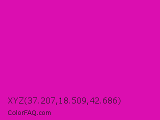 XYZ 37.207,18.509,42.686 Color is a normal magenta color and the nearest color is Hollywood Cerise #f400a1. Hex code #db0eb0 and RGB value is rgb(219,14,176). In RGB color space, this color is composed of 86% red, 5% green, 69% blue, In CMYK color space, this color is composed of 0% cyan, 94% magenta, 20% yellow , 14% black , In HSL color space, this color has a hue angle of 313° , 88% saturation and 46% lightness.