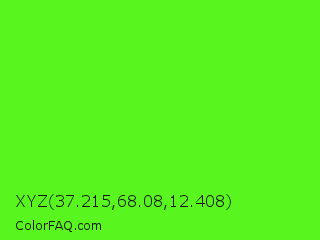 XYZ 37.215,68.08,12.408 Color is a normal green color and the nearest color is Neon Green #39ff14. Hex code #58f61e and RGB value is rgb(88,246,30). In RGB color space, this color is composed of 35% red, 96% green, 12% blue, In CMYK color space, this color is composed of 64% cyan, 0% magenta, 88% yellow , 4% black , In HSL color space, this color has a hue angle of 104° , 92% saturation and 54% lightness.