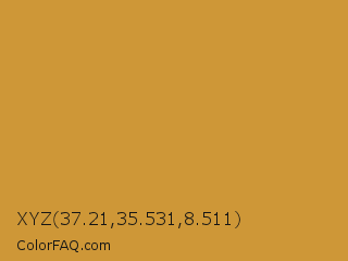 XYZ 37.21,35.531,8.511 Color is a normal orange color and the nearest color is Satin Sheen Gold #cba135. Hex code #ce9737 and RGB value is rgb(206,151,55). In RGB color space, this color is composed of 81% red, 59% green, 22% blue, In CMYK color space, this color is composed of 0% cyan, 27% magenta, 73% yellow , 19% black , In HSL color space, this color has a hue angle of 38° , 61% saturation and 51% lightness.