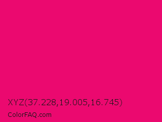 XYZ 37.228,19.005,16.745 Color is a normal rose color and the nearest color is Red Purple #e40078. Hex code #eb096f and RGB value is rgb(235,9,111). In RGB color space, this color is composed of 92% red, 4% green, 44% blue, In CMYK color space, this color is composed of 0% cyan, 96% magenta, 53% yellow , 8% black , In HSL color space, this color has a hue angle of 333° , 93% saturation and 48% lightness.