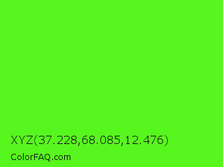 XYZ 37.228,68.085,12.476 Color is a normal green color and the nearest color is Neon Green #39ff14. Hex code #58f61f and RGB value is rgb(88,246,31). In RGB color space, this color is composed of 35% red, 96% green, 12% blue, In CMYK color space, this color is composed of 64% cyan, 0% magenta, 87% yellow , 4% black , In HSL color space, this color has a hue angle of 104° , 92% saturation and 54% lightness.