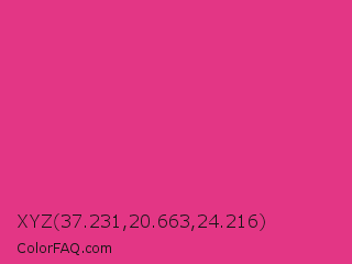 XYZ 37.231,20.663,24.216 Color is a normal rose color and the nearest color is Cerise #da3287. Hex code #e33685 and RGB value is rgb(227,54,133). In RGB color space, this color is composed of 89% red, 21% green, 52% blue, In CMYK color space, this color is composed of 0% cyan, 76% magenta, 41% yellow , 11% black , In HSL color space, this color has a hue angle of 333° , 76% saturation and 55% lightness.