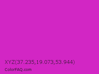 XYZ 37.235,19.073,53.944 Color is a normal magenta color and the nearest color is Steel Pink #cc33cc. Hex code #d226c4 and RGB value is rgb(210,38,196). In RGB color space, this color is composed of 82% red, 15% green, 77% blue, In CMYK color space, this color is composed of 0% cyan, 82% magenta, 7% yellow , 18% black , In HSL color space, this color has a hue angle of 305° , 69% saturation and 49% lightness.