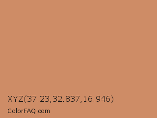 XYZ 37.23,32.837,16.946 Color is a normal orange color and the nearest color is Antique Brass #c88a65. Hex code #ce8c66 and RGB value is rgb(206,140,102). In RGB color space, this color is composed of 81% red, 55% green, 40% blue, In CMYK color space, this color is composed of 0% cyan, 32% magenta, 50% yellow , 19% black , In HSL color space, this color has a hue angle of 22° , 51% saturation and 60% lightness.