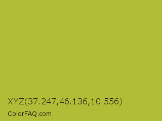 XYZ 37.247,46.136,10.556 Color is a normal yellow color and the nearest color is Android Green #a4c639. Hex code #b2bd37 and RGB value is rgb(178,189,55). In RGB color space, this color is composed of 70% red, 74% green, 22% blue, In CMYK color space, this color is composed of 6% cyan, 0% magenta, 71% yellow , 26% black , In HSL color space, this color has a hue angle of 65° , 55% saturation and 48% lightness.