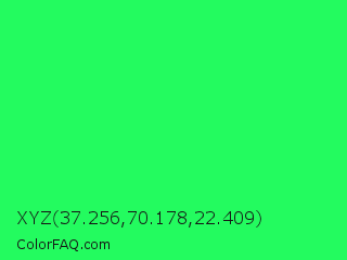 XYZ 37.256,70.178,22.409 Color is a normal green color and the nearest color is Malachite #0bda51. Hex code #23fb5f and RGB value is rgb(35,251,95). In RGB color space, this color is composed of 14% red, 98% green, 37% blue, In CMYK color space, this color is composed of 86% cyan, 0% magenta, 62% yellow , 2% black , In HSL color space, this color has a hue angle of 137° , 96% saturation and 56% lightness.