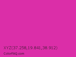XYZ 37.258,19.841,38.912 Color is a normal magenta color and the nearest color is Frostbite #e936a7. Hex code #db2ea8 and RGB value is rgb(219,46,168). In RGB color space, this color is composed of 86% red, 18% green, 66% blue, In CMYK color space, this color is composed of 0% cyan, 79% magenta, 23% yellow , 14% black , In HSL color space, this color has a hue angle of 318° , 71% saturation and 52% lightness.