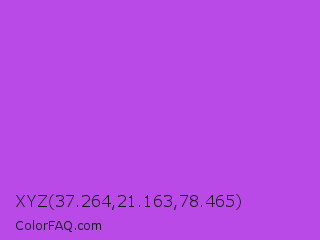 XYZ 37.264,21.163,78.465 Color is a normal purple color and the nearest color is Medium Orchid #ba55d3. Hex code #ba4ae8 and RGB value is rgb(186,74,232). In RGB color space, this color is composed of 73% red, 29% green, 91% blue, In CMYK color space, this color is composed of 20% cyan, 68% magenta, 0% yellow , 9% black , In HSL color space, this color has a hue angle of 283° , 77% saturation and 60% lightness.
