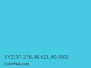XYZ 37.278,48.621,80.093 Color is a normal cyan color and the nearest color is Sea Serpent #4bc7cf. Hex code #46c9e3 and RGB value is rgb(70,201,227). In RGB color space, this color is composed of 27% red, 79% green, 89% blue, In CMYK color space, this color is composed of 69% cyan, 11% magenta, 0% yellow , 11% black , In HSL color space, this color has a hue angle of 190° , 74% saturation and 58% lightness.