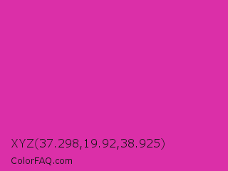 XYZ 37.298,19.92,38.925 Color is a normal magenta color and the nearest color is Frostbite #e936a7. Hex code #db2fa8 and RGB value is rgb(219,47,168). In RGB color space, this color is composed of 86% red, 18% green, 66% blue, In CMYK color space, this color is composed of 0% cyan, 79% magenta, 23% yellow , 14% black , In HSL color space, this color has a hue angle of 318° , 70% saturation and 52% lightness.