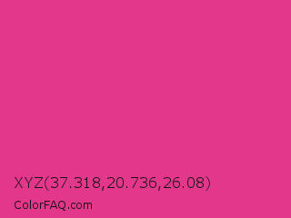 XYZ 37.318,20.736,26.08 Color is a normal rose color and the nearest color is Cerise #da3287. Hex code #e2378a and RGB value is rgb(226,55,138). In RGB color space, this color is composed of 89% red, 22% green, 54% blue, In CMYK color space, this color is composed of 0% cyan, 76% magenta, 39% yellow , 11% black , In HSL color space, this color has a hue angle of 331° , 75% saturation and 55% lightness.