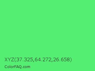 XYZ 37.325,64.272,26.658 Color is a light green color and the nearest color is Very Light Malachite Green #64e986. Hex code #54ee73 and RGB value is rgb(84,238,115). In RGB color space, this color is composed of 33% red, 93% green, 45% blue, In CMYK color space, this color is composed of 65% cyan, 0% magenta, 52% yellow , 7% black , In HSL color space, this color has a hue angle of 132° , 82% saturation and 63% lightness.
