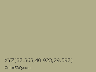 XYZ 37.363,40.923,29.597 Color is a light yellow color and the nearest color is Hillary #aca586. Hex code #b0ad89 and RGB value is rgb(176,173,137). In RGB color space, this color is composed of 69% red, 68% green, 54% blue, In CMYK color space, this color is composed of 0% cyan, 2% magenta, 22% yellow , 31% black , In HSL color space, this color has a hue angle of 55° , 20% saturation and 61% lightness.