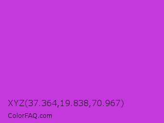 XYZ 37.364,19.838,70.967 Color is a normal purple color and the nearest color is Steel Pink #cc33cc. Hex code #c438de and RGB value is rgb(196,56,222). In RGB color space, this color is composed of 77% red, 22% green, 87% blue, In CMYK color space, this color is composed of 12% cyan, 75% magenta, 0% yellow , 13% black , In HSL color space, this color has a hue angle of 291° , 72% saturation and 55% lightness.