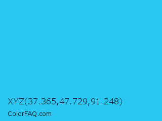 XYZ 37.365,47.729,91.248 Color is a normal cyan color and the nearest color is Spiro Disco Ball #0fc0fc. Hex code #29c7f2 and RGB value is rgb(41,199,242). In RGB color space, this color is composed of 16% red, 78% green, 95% blue, In CMYK color space, this color is composed of 83% cyan, 18% magenta, 0% yellow , 5% black , In HSL color space, this color has a hue angle of 193° , 89% saturation and 55% lightness.