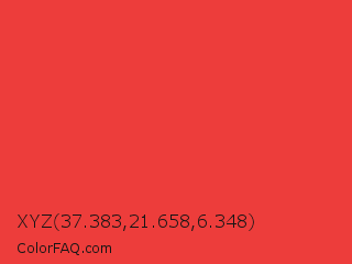 XYZ 37.383,21.658,6.348 Color is a normal red color and the nearest color is Cinnabar #e34234. Hex code #ed3d3b and RGB value is rgb(237,61,59). In RGB color space, this color is composed of 93% red, 24% green, 23% blue, In CMYK color space, this color is composed of 0% cyan, 74% magenta, 75% yellow , 7% black , In HSL color space, this color has a hue angle of 1° , 83% saturation and 58% lightness.