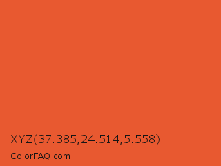 XYZ 37.385,24.514,5.558 Color is a normal red color and the nearest color is Flamingo #f2552a. Hex code #e85930 and RGB value is rgb(232,89,48). In RGB color space, this color is composed of 91% red, 35% green, 19% blue, In CMYK color space, this color is composed of 0% cyan, 62% magenta, 79% yellow , 9% black , In HSL color space, this color has a hue angle of 13° , 80% saturation and 55% lightness.