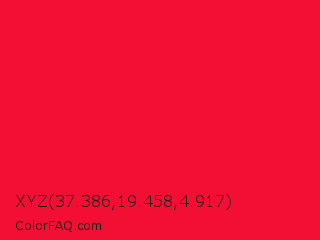 XYZ 37.386,19.458,4.917 Color is a normal red color and the nearest color is Torch Red #fd0e35. Hex code #f20f33 and RGB value is rgb(242,15,51). In RGB color space, this color is composed of 95% red, 6% green, 20% blue, In CMYK color space, this color is composed of 0% cyan, 94% magenta, 79% yellow , 5% black , In HSL color space, this color has a hue angle of 350° , 90% saturation and 50% lightness.