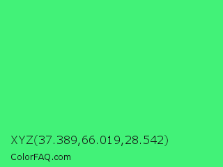 XYZ 37.389,66.019,28.542 Color is a normal green color and the nearest color is UFO Green #3cd070. Hex code #42f278 and RGB value is rgb(66,242,120). In RGB color space, this color is composed of 26% red, 95% green, 47% blue, In CMYK color space, this color is composed of 73% cyan, 0% magenta, 50% yellow , 5% black , In HSL color space, this color has a hue angle of 138° , 87% saturation and 60% lightness.