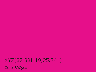 XYZ 37.391,19,25.741 Color is a normal magenta color and the nearest color is Barbie Pink #e0218a. Hex code #e60f8a and RGB value is rgb(230,15,138). In RGB color space, this color is composed of 90% red, 6% green, 54% blue, In CMYK color space, this color is composed of 0% cyan, 93% magenta, 40% yellow , 10% black , In HSL color space, this color has a hue angle of 326° , 88% saturation and 48% lightness.