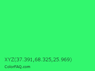 XYZ 37.391,68.325,25.969 Color is a normal green color and the nearest color is UFO Green #3cd070. Hex code #32f76e and RGB value is rgb(50,247,110). In RGB color space, this color is composed of 20% red, 97% green, 43% blue, In CMYK color space, this color is composed of 80% cyan, 0% magenta, 55% yellow , 3% black , In HSL color space, this color has a hue angle of 138° , 92% saturation and 58% lightness.