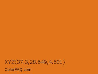 XYZ 37.3,28.649,4.601 Color is a normal orange color and the nearest color is Tango #ed7a1c. Hex code #e0751b and RGB value is rgb(224,117,27). In RGB color space, this color is composed of 88% red, 46% green, 11% blue, In CMYK color space, this color is composed of 0% cyan, 48% magenta, 88% yellow , 12% black , In HSL color space, this color has a hue angle of 27° , 78% saturation and 49% lightness.