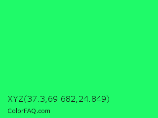 XYZ 37.3,69.682,24.849 Color is a normal green color and the nearest color is Spring Green #00ff7f. Hex code #1ffa69 and RGB value is rgb(31,250,105). In RGB color space, this color is composed of 12% red, 98% green, 41% blue, In CMYK color space, this color is composed of 88% cyan, 0% magenta, 58% yellow , 2% black , In HSL color space, this color has a hue angle of 140° , 96% saturation and 55% lightness.