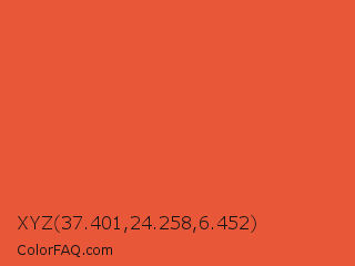 XYZ 37.401,24.258,6.452 Color is a normal red color and the nearest color is Flame Pea #da5b38. Hex code #e85738 and RGB value is rgb(232,87,56). In RGB color space, this color is composed of 91% red, 34% green, 22% blue, In CMYK color space, this color is composed of 0% cyan, 63% magenta, 76% yellow , 9% black , In HSL color space, this color has a hue angle of 11° , 79% saturation and 56% lightness.