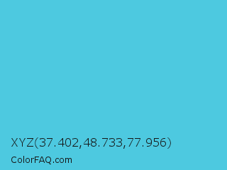 XYZ 37.402,48.733,77.956 Color is a normal cyan color and the nearest color is Sea Serpent #4bc7cf. Hex code #4dc9e0 and RGB value is rgb(77,201,224). In RGB color space, this color is composed of 30% red, 79% green, 88% blue, In CMYK color space, this color is composed of 66% cyan, 10% magenta, 0% yellow , 12% black , In HSL color space, this color has a hue angle of 189° , 70% saturation and 59% lightness.