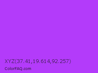 XYZ 37.41,19.614,92.257 Color is a light purple color and the nearest color is Veronica #a020f0. Hex code #b33bfa and RGB value is rgb(179,59,250). In RGB color space, this color is composed of 70% red, 23% green, 98% blue, In CMYK color space, this color is composed of 28% cyan, 76% magenta, 0% yellow , 2% black , In HSL color space, this color has a hue angle of 278° , 95% saturation and 61% lightness.