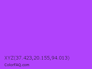 XYZ 37.423,20.155,94.013 Color is a light purple color and the nearest color is Navy Purple #9457eb. Hex code #b042fc and RGB value is rgb(176,66,252). In RGB color space, this color is composed of 69% red, 26% green, 99% blue, In CMYK color space, this color is composed of 30% cyan, 74% magenta, 0% yellow , 1% black , In HSL color space, this color has a hue angle of 275° , 97% saturation and 62% lightness.