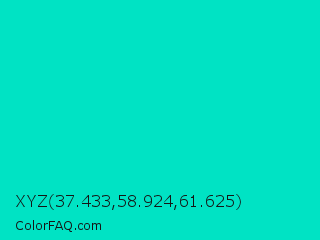XYZ 37.433,58.924,61.625 Color is a normal cyan color and the nearest color is Robins Egg Blue #00cccc. Hex code #00e3c4 and RGB value is rgb(0,227,196). In RGB color space, this color is composed of 0% red, 89% green, 77% blue, In CMYK color space, this color is composed of 100% cyan, 0% magenta, 14% yellow , 11% black , In HSL color space, this color has a hue angle of 172° , 100% saturation and 45% lightness.