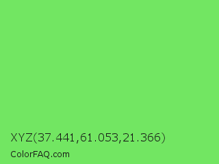 XYZ 37.441,61.053,21.366 Color is a light green color and the nearest color is Pastel Green #77dd77. Hex code #72e662 and RGB value is rgb(114,230,98). In RGB color space, this color is composed of 45% red, 90% green, 38% blue, In CMYK color space, this color is composed of 50% cyan, 0% magenta, 57% yellow , 10% black , In HSL color space, this color has a hue angle of 113° , 73% saturation and 64% lightness.